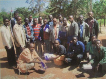At our last trip, in July 2010, I met with Oshe Burje. He is a church leader in Burji who works with all the rural churches in the Burji, Guji, and Konso areas. I taught him how to use the Saber players with the SD cards and internal memory, how to use the laptop recorder to make more SD and CD programs, and how to use the CD players for the loudspeakers. We put together a notebook for each of the rural churches and a tracking system. Then I returned to the USA and he went to work. So what has been the result of all this work? In the 6 months since we introduced this Rural Church Bible Teaching, two church leaders were chosen from 14 rural churches, and two church leaders were chosen at each of the 5 loudspeaker-churches. These men came together for training by Oshe. And were sent home with a plan for gathering the churches to listen. Oshe teaching the Saber program to rural church leaders.