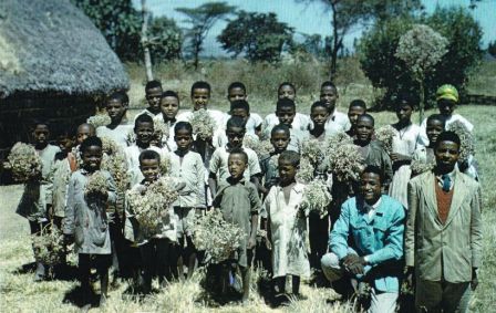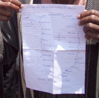 (picture: old church school) He studied at the Bible School for 2 years; he was one of the first students at the Burji mission station called Gembo. He knew my father. My father was in charge of the academic school at Gembo. Students who completed the first 3 years were sent to start "church-schools" in their home villages; these 3rd-grade graduates were to become teachers of 1st and 2nd grade in their village churches. My father would take treks, gone for weeks, as he checked on the church-schools. Olka remembered my father on these treks. One day he drew me a map of the villages that my father would visit.