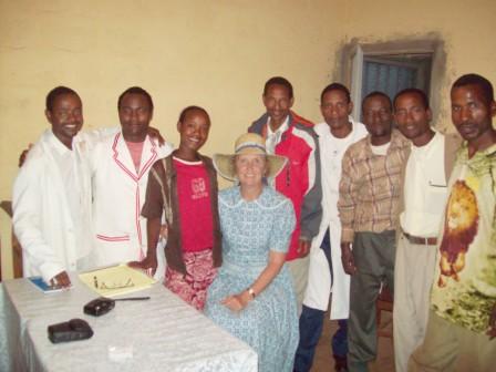The Clinic is located in a dry valley-desert area that is easily accessible to all the people living in the mountains and valleys. It lies at the juncture of the Amaro, the Burji and the Guji tribes. By vehicle, it is about 30 minutes drive from Soyama; since no people have vehicles, we really should talk in terms of walking time – it is about 4 hours walking time from Clinic to Soyama Town (the nearest medical service). The clinic serves people who would otherwise walk 12-15 hours to get to the government clinic in Soyama; many of these people would die en route. (The Soyama Town Clinic has about the same level of service as the Galana Clinic: simple lab, simple nursing, pharmacy, no surgery or acute emergency care.) Currently, we have a license as a “medium” clinic. We are staffed with a chaplain, a “senior” nurse, a “junior” nurse, an accountant, a pharmacist, 2 guards, and a janitor. (We are looking for a lab tech as well.) All of these positions are “full time.” Combined salaries are about $8,000/yr. Clinic hours are 8:30-12:30 and 1:30-5:30, Mon-Fri, with emergency services provided on weekends and evenings. A nurse and the pharmacist are always on the compound. We have simple housing for the professional staff; each person has a room about 10’X14’; they all cook together in a separate kitchen room, and they share an outside pit toilet. Their living quarters are about 50 feet from the clinic. The clinic building has 7 rooms: laboratory, observation/delivery room, pharmacy, exam room, treatment room, injection room, and registration room. The front of the clinic has a long porch for waiting patients, and we have just completed a separate waiting shelter. The clinic staff.