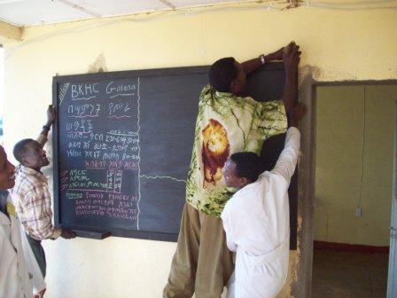So you see that the spiritual work is done alongside the medical work. To help the staff in this spiritual ministry, the chaplain has devotions and prayer time for 20 minutes each day before the clinic opens at 8:30. And he prays publicly, dedicating the day’s work to the Lord for His glory. I cannot find words to express the great blessing that Chaplain Solomon is to me! Such a joyful, loving man – he is the perfect person for this work! The Burji church leaders were wise in choosing him for this work. On the medical front, the primary diagnoses are infections, malaria, parasites, wounds, typhoid, seizures, and eye diseases. About 10 babies have been birthed at the clinic. Every Thursday morning we have special clinic for expectant mothers, so we expect this service to increase. Accidents/trauma/burns are also possible, especially as the war wages nearby. We took some much-needed medical equipment with us in November. Until our arrival, they were hard-pressed even to have a stethoscope. Now they enjoy a pulse oxymeter, fetal doppler, EKG machine, several digital blood pressure machines, digital thermometers, pediatric and infant stethoscopes, an assortment of orthopedic aids, and a resource library of 17 books. I wish you could have seen the eyes of Gezaheen (senior nurse) when I pulled out those library books! He told me that nowhere in Ethiopia do they have such libraries. We also brought some good laboratory equipment, including a microscope that can connect to a computer. With this machine, they can capture microscopic images and send them by email to specialists for consultation, or print large pictures for patient education, or send them with the patient in case of transfer to a hospital. Praise God for His grace to us, in providing people to donate supplies, and in arranging such easy access to these supplies through the internet! We live in a very blessed country to have all this available to us. Let us not take it for granted. Let us remember to thank the Lord for His grace to us in this way. Caring for a girl's wounded finger.