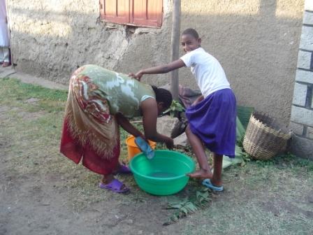 Bathing children. Melese has suffered much because of the Gospel. He doesn’t brag about it; in fact, he tells the stories with hesitation (there is something almost sacred in these stories of God’s personal faithfulness). One such story is the night of the last birth in his family. The births of all his children had been difficult. When the last one was due to be born, their family was living in a row of rooms. To one side was a Muslim family and to the other side was an Orthodox family; they were hated by both. (His wife had already been beaten by neighboring Muslims while he was away.) Melese was anxious that his wife’s childbirth could disturb the people next door and inflame antagonism. There was no place to pray in private; so he went to the shintabet (toilet house) to pray. Here, in the “lowest part of the earth,” he pleaded with God to ease his wife’s discomfort and help them. As he lifted himself up from the earth, God spoke to him. “I will provide for you,” He said. In faith Melese returned to his home and cleaned a razor blade (to cut the birth cord). He gathered his family in a circle, they held hands, and in unison they called “Jesus!” “Jesus!”, “Jesus!” Between the second and third “Jesus” his wife gave a push and out popped a beautiful little daughter – no pain, no strain, no difficulty. The complete birthing took only half an hour! Do you know what they named that little girl? “Salam,” which means “Peace.” I’ve met Salam; she has a peaceful spirit about her that is truly rare. Today she’s about 8 years old, and already she is full of the power of prayer. Melese told me that when she was 4 years old she wanted to pray at their family devotions; he kept asking the oldest daughter to pray, but finally he consented and allowed Salam to pray. As she opened her mouth to speak, the whole room was filled with a heavenly light. When we came back from a village I was sporting an arm swollen and discolored from (spider?) bites. The leaders were anxious about it; even I was cautious about it. But on the third day the bites were almost gone; that was the morning that Salam came to our room and immediately checked my arm. She had been praying, and I have no doubt that our Lord was hearing her sweet voice. She was born in faith, and she is living in faith, the faith of our Lord Jesus, the Name called at her birth. Salam with a dolly given to her by a girl in Virginia. Sharing a snack in Salam's home. One burden the Alaba Town leaders shared with us is the financial support of their evangelists. We asked for details. Most of the leaders are either public school teachers or small business owners. Their income is about 1500-1600 Ethiopian birr a month. The range of income for the evangelists is only 300-700 birr a month! It is completely impossible for these evangelists to support their families on such low income. As a result, they are suffering chronic malnutrition, persistent illness, etc. And these evangelists bear an extra burden. They are nose-to-nose with needy people in their ministry. How can they just pray and walk away? So their small incomes not only need to cover their families, but also those spontaneous situations that develop in the normal course of their ministries. (Note: unlike most American homes, these are single-income families.) The Lord has burdened us with this need. So we are asking the Lord’s servants in America to consider giving to a special Evangelists Fund. These monies will be given to the church to augment the evangelists’ meager salaries. It will focus on those evangelists most in need. Sometimes people here have asked us if they can “sponsor” an evangelist. We are skittish about this personal approach, because the Evil One uses it to divide evangelists between “sponsored ones” and “unsponsored ones”; pride dances with the sponsored group and depression and discouragement haunts the unsponsored group. We have discussed this with the church leaders and we all feel that the best thing is to collect funds designated for evangelist living needs (including clothing, food, medical and children’s school expenses). These funds will be distributed irregularly (as the income is received), and disproportionately (as the various evangelists have needs). So will you pray about this situation and ask our Lord if He wants you to share this burden of relief? If He directs you to help with this need, please be sure to note “For Evangelists” on your check. We promise you that every cent will be given directly to the Ethiopian church; we do not deduct “administrative fees.” And every cent will be used by the Ethiopian church for the needs of the evangelists. Your Brothers in Christ. The Alaba Evangelists.