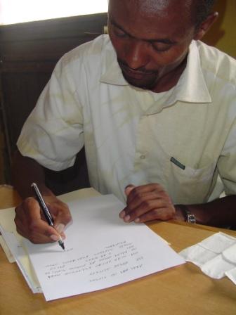 Melli (middle man in the picture) is 38 years old. He is from a large town far from Alaba. He was raised in the Orthodox Church. At about age 20, while very sick in a hospital, he had a vision from Jesus, and he became one of His followers. His family disowned him and for 2 years he lived in the church. This was during the Derg military (communist) rule of Ethiopia. Most churches were closed by the government during this time, but the Durami church remained open. He came to Alaba as an evangelist 7 years ago. He has attended the Bible School in Alaba. One of his favorite passages in the Bible, which he wants to relay to his American brethren, is from Psalm 91: It is a good thing to give thanks unto the Lord, And to sing praises unto thy name, O most High. To shew forth thy lovingkindness in the morning, And thy faithfulness every night. I asked him to give me just two examples of the