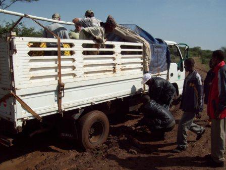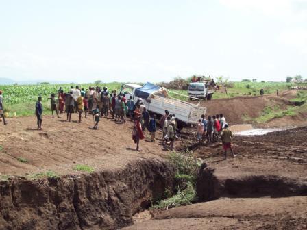 A great highlight of the ministry trip to Burji was the visit to the Konso churches. The Konso district lies to the southwest of the Burji District. There are very few churches here, so the Burji churches are reaching out and planting new churches. On Saturday morning, May 30, before the sun was up, we loaded into the back end of an open-bed “refugee truck.” After driving about 7 hours and getting stuck in the mud 3 times, we arrived at the village of Gedene Benea. Throughout this trip, repeatedly the church leaders got in the mud, gathering stones and branches, doing whatever needed to be done to get us to the destination.